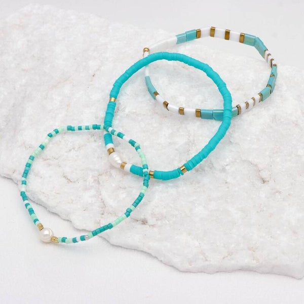 Ontdek de elegante charme van dit exclusieve set van drie armbanden, met een unieke combinatie van verguld roestvrij staal, TILA & FIMO kralen, zoetwaterparels en gekleurde stenen. Dit set is ontworpen voor iedereen die op zoek is naar stijlvolle en veelzijdige sieraden die geschikt zijn voor een gevoelige huid. Het wordt geleverd in een luxe turkooizen doos met kussentje, waardoor het het perfecte cadeau is voor elke gelegenheid.